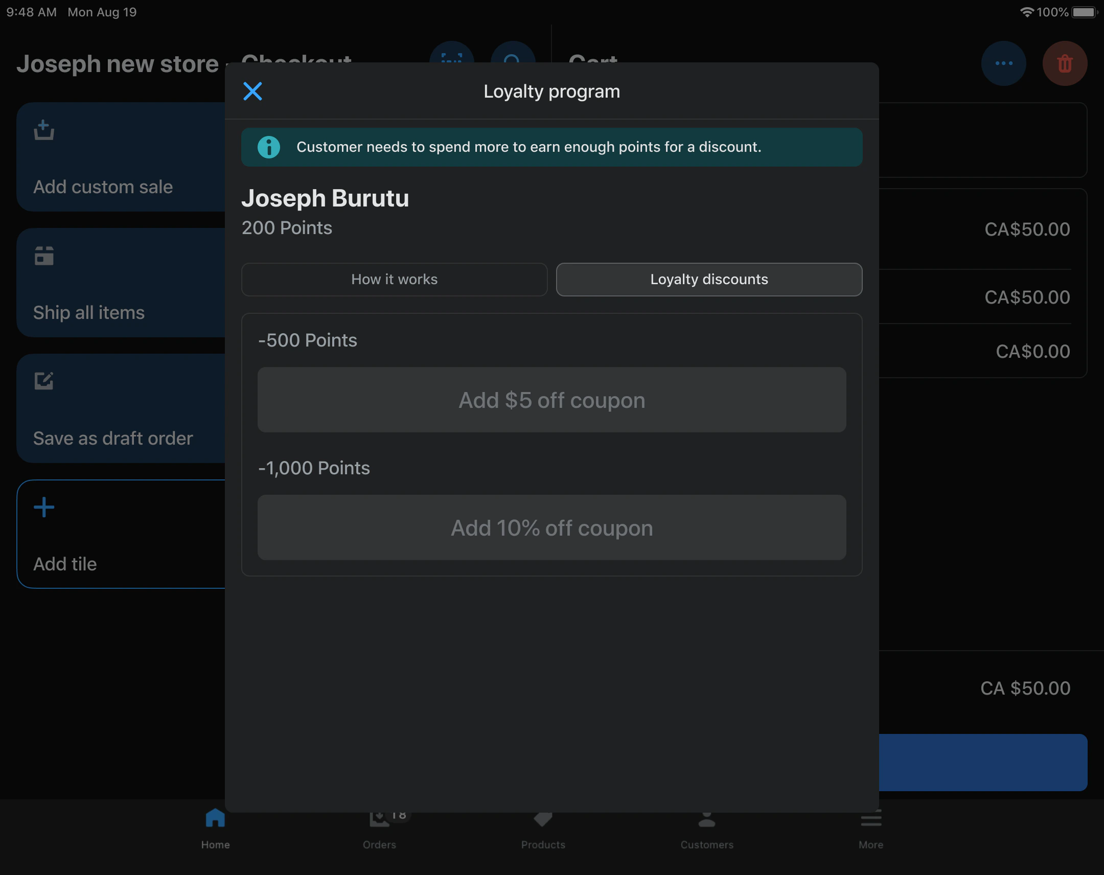 Tap the loyalty program tile to open the loyalty popup, the home of your loyalty program. A customer and a product must both be added to the cart in order for loyalty points to be earned or spent. The tile’s appearance and subtitle helpfully change to inform the retail staff member what action they or the customer need to take in any given scenario.| Tile display | State | Action |