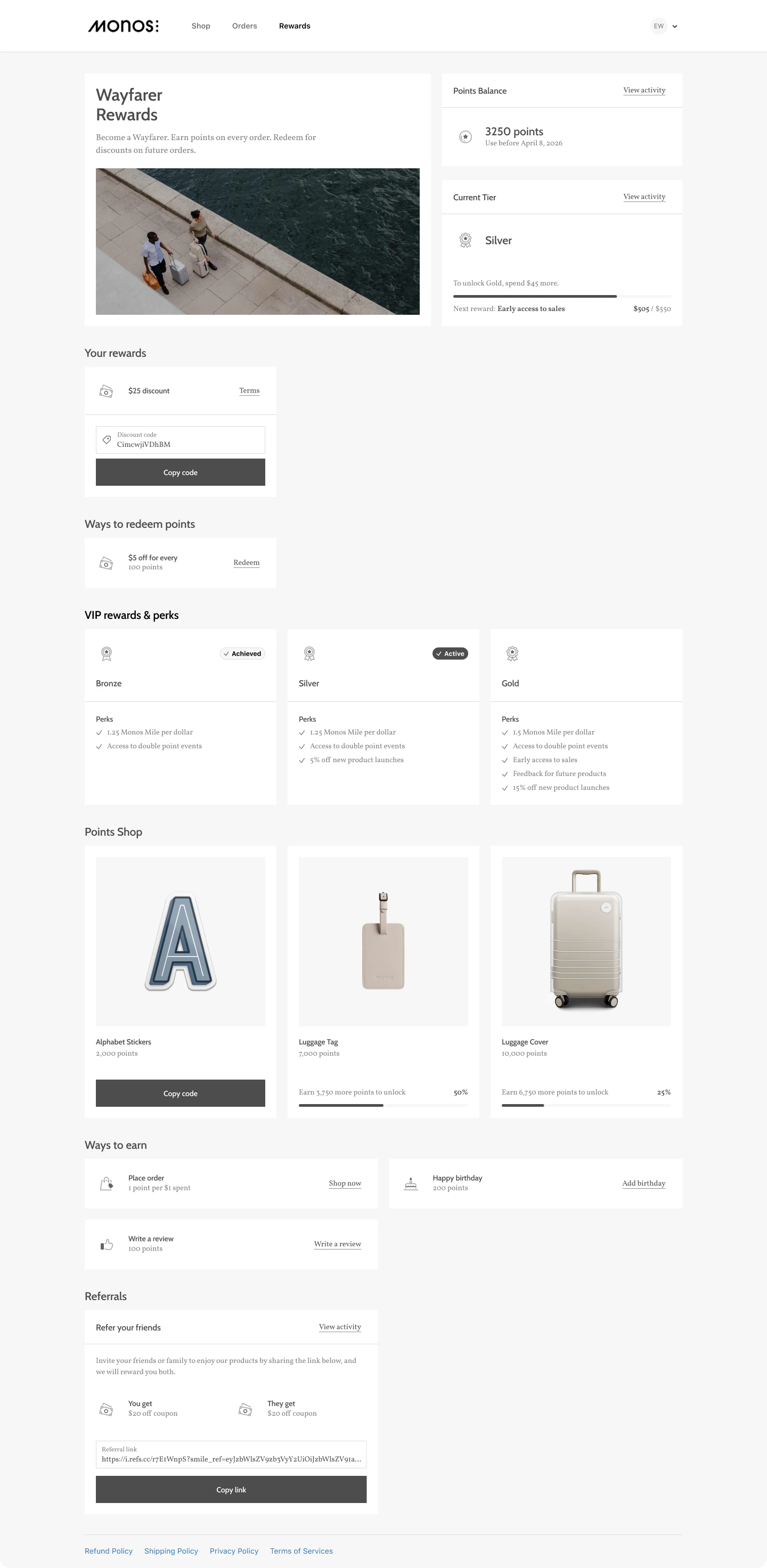 Once added to your customer account area, Loyalty Hub is created and populated automatically—no code edits or page builders required. The page works with all loyalty program configurations, including your ways to earn points and ways to spend points. When you update your loyalty program—such as adding new earning or spending options, updating brand imagery, or enabling or disabling features—Loyalty Hub updates automatically. You can further customize the page by choosing typography, colors, and section titles that match your brand and create excitement for your customers.