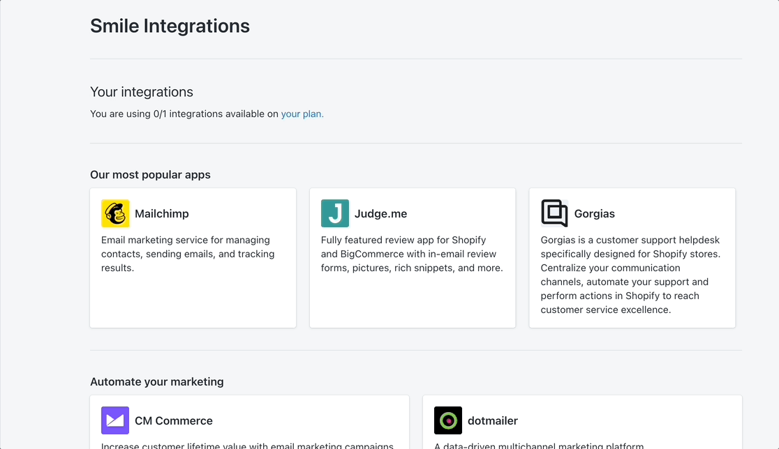 Connecting your eCommerce applications together unlocks a new level of superpowers to help grow and promote your business. At Smile, we want to make creating and integrating a rewards program as easy as possible.Feature availability: App integrations are available on Essential, Standard, Growth, Plus, and Enterprise plans. The number of app integrations you can connect depends on your plan.