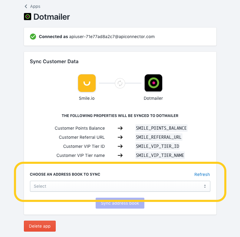 Note: Smile will sync customers to the address book that you choose, regardless of whether they already exist in Dotdigital. We recommend syncing to an address book that includes all of your online store’s customer accounts.