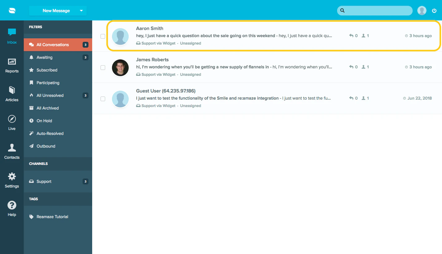 Re:amaze is a customer relationship management (CRM) tool that allows you to consolidate all of your channels of contact with customers in one place. With live chat capabilities, Re:amaze is a powerful tool for keeping customers happy and informed. To make your support even more effective, Smile rewards data is built into Re:amaze conversation pages.Smile apps/integrations are only available on a Smile paid plan, on the Shopify and BigCommerce platforms.