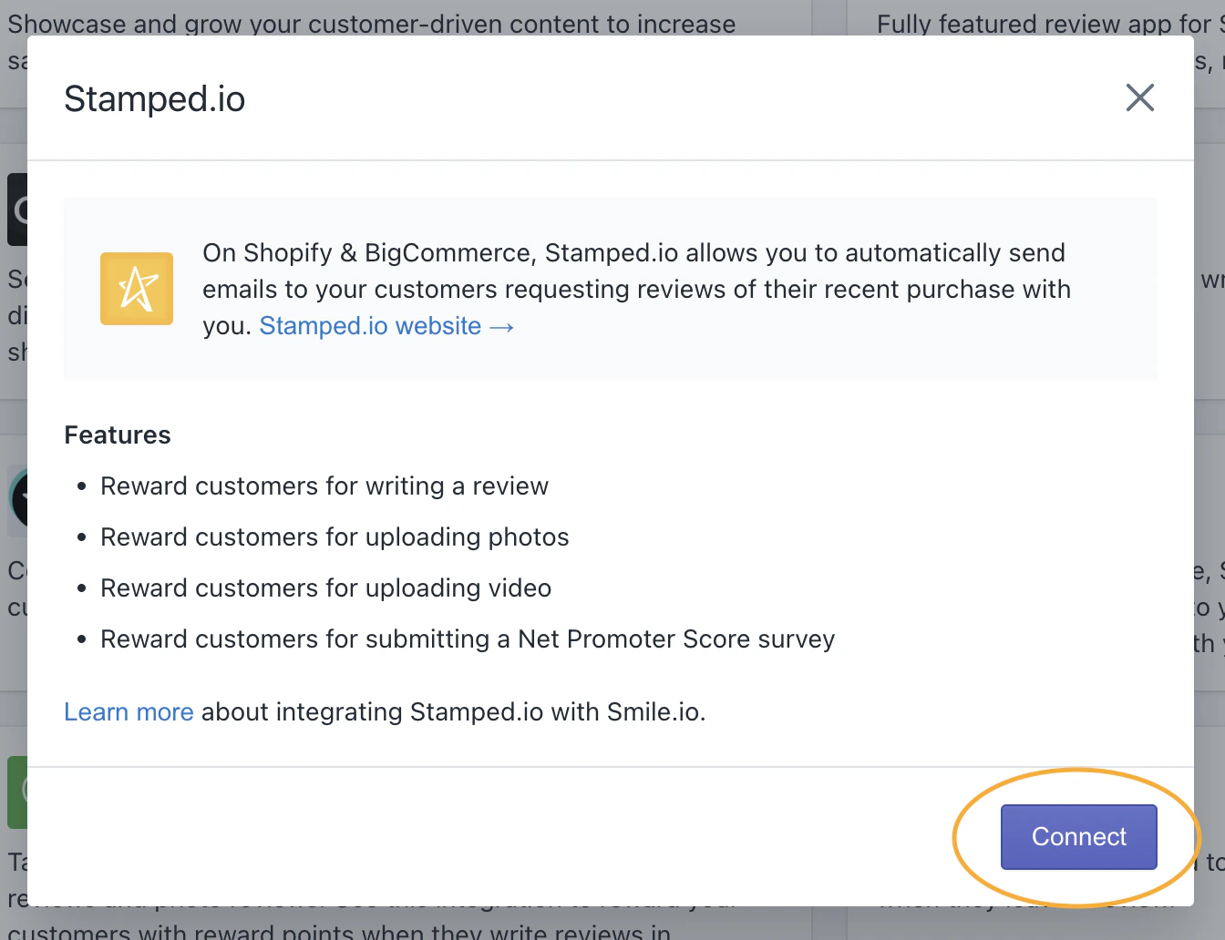 On the Apps page of your Smile Admin, select the Stamped.io app from the listings.