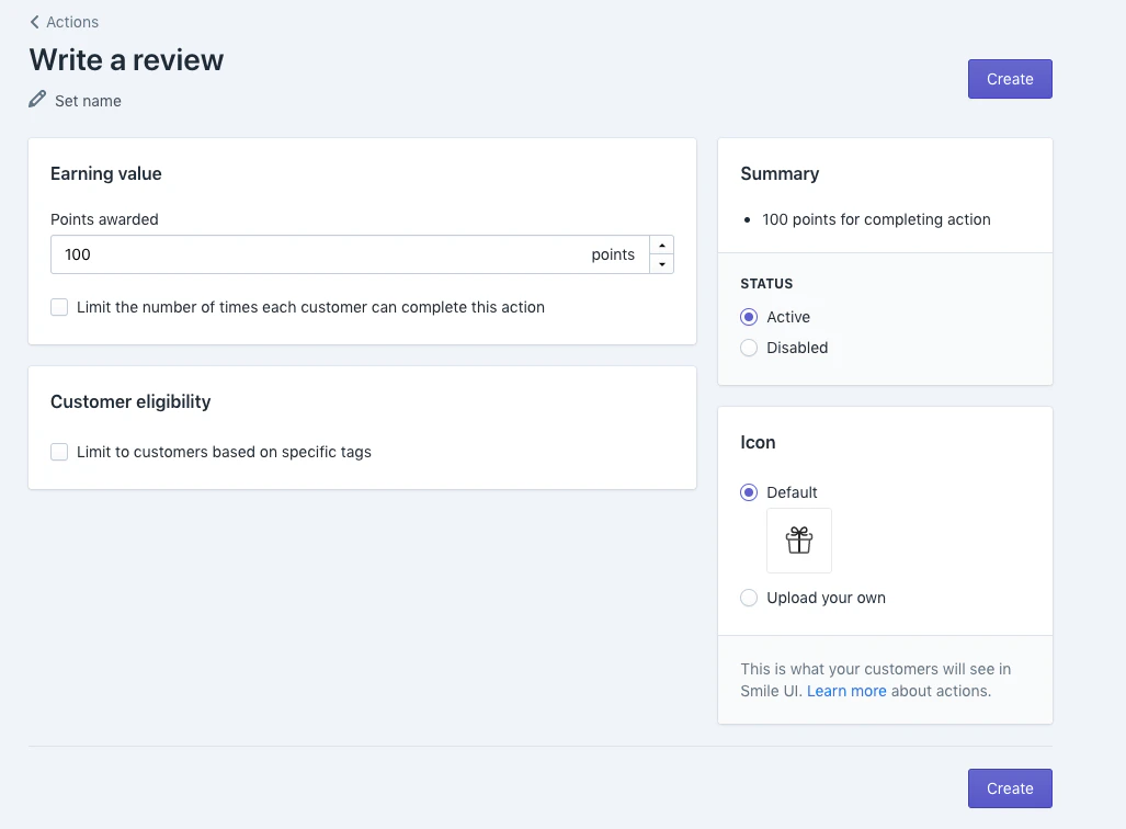 Once the Stamped app is connected to your Smile account, you need to set up the Stamped earning action.You can create an earning rule for: