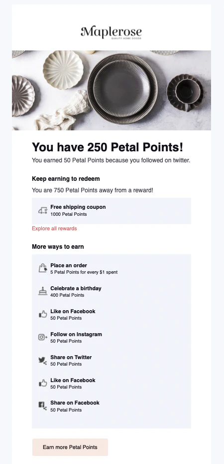 What it is: An email is sent to customers when they’ve earned points for completing an earning action, like completing a purchase or social sharing.