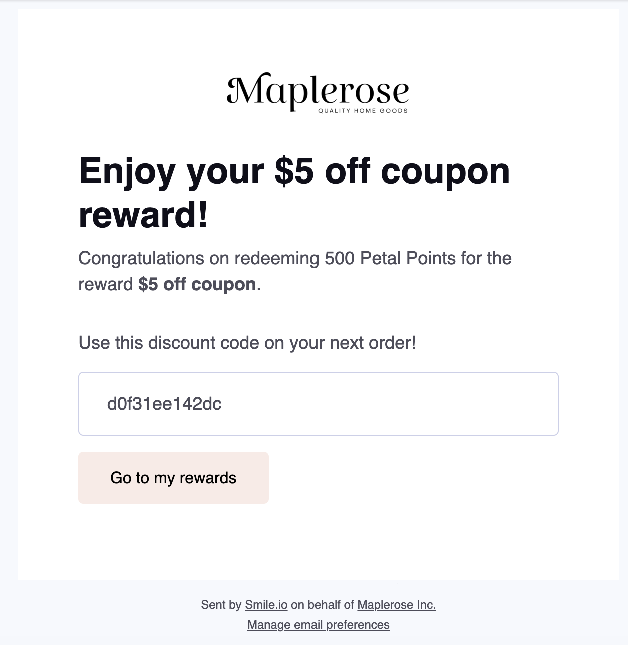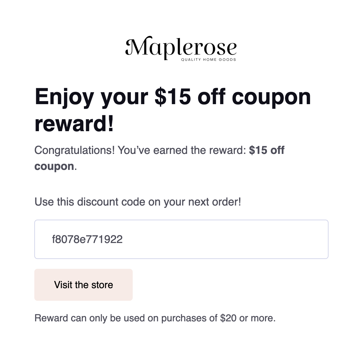 Why it’s important: Making it easy for new customers to use their reward code will make it easier for you to grow your community. When they’ve used their new reward towards a purchase, they’ll be more likely to continue engaging with your program.
