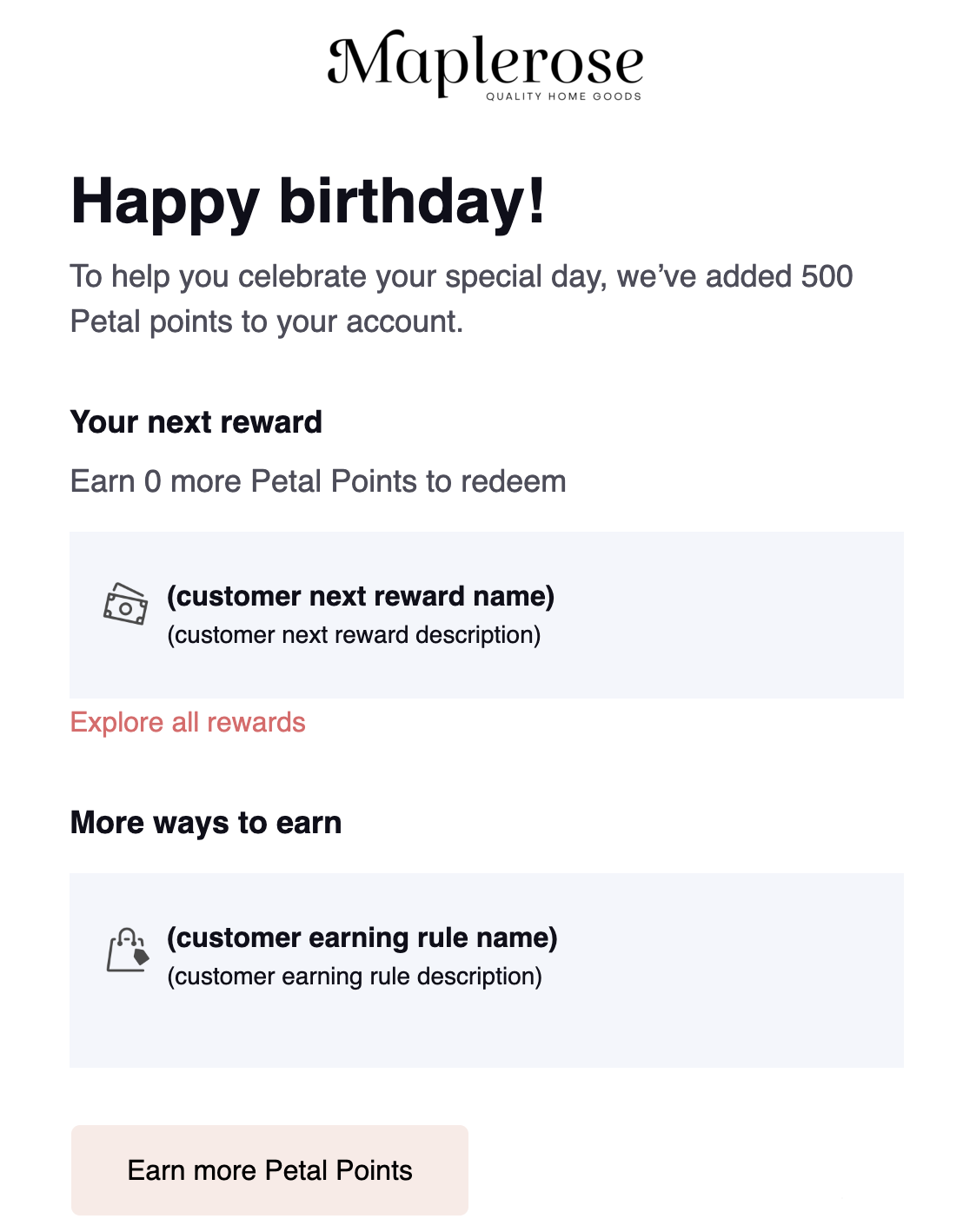 What it is: An email sent to program members on their birthday, provided they have given you their birthday points in your customer Panel and you’ve enabled birthday rewards.