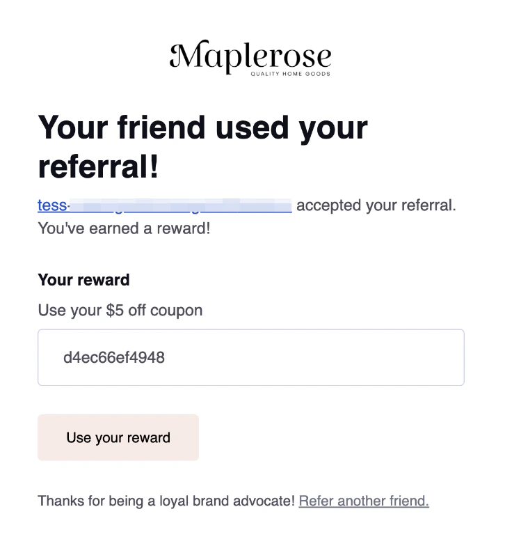 What it is: An email sent to a program member when their Friend has made a purchase using their referral reward code.