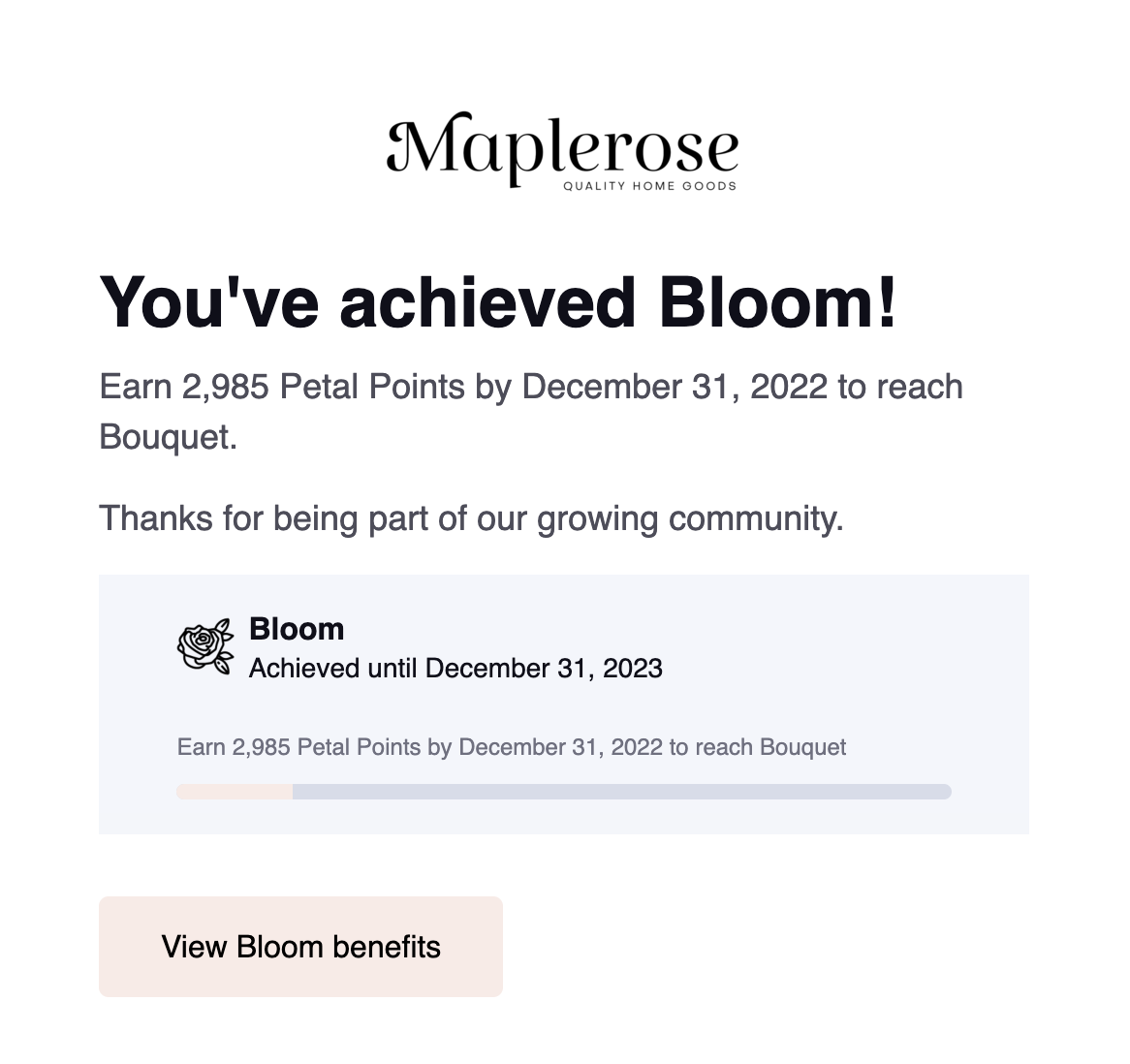 Why it’s important: Celebrating a VIP tier achievement with your customers will show them that you want them to enjoy the full value they’ve earned as part of your brand community. When you help them see and take advantage of value sooner, they’ll be more likely to come back to your store to make additional purchases.