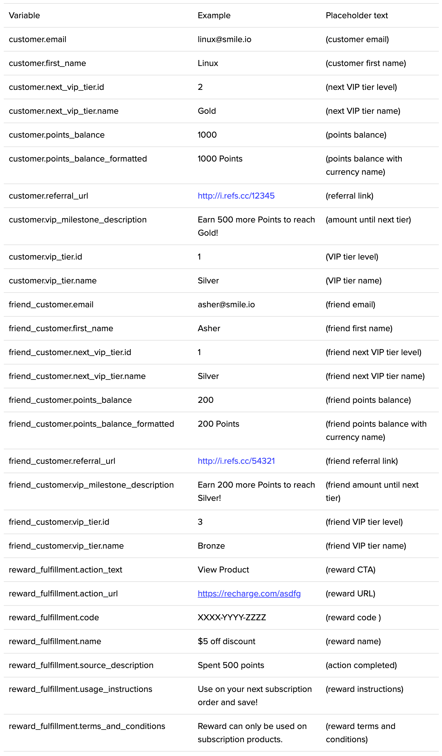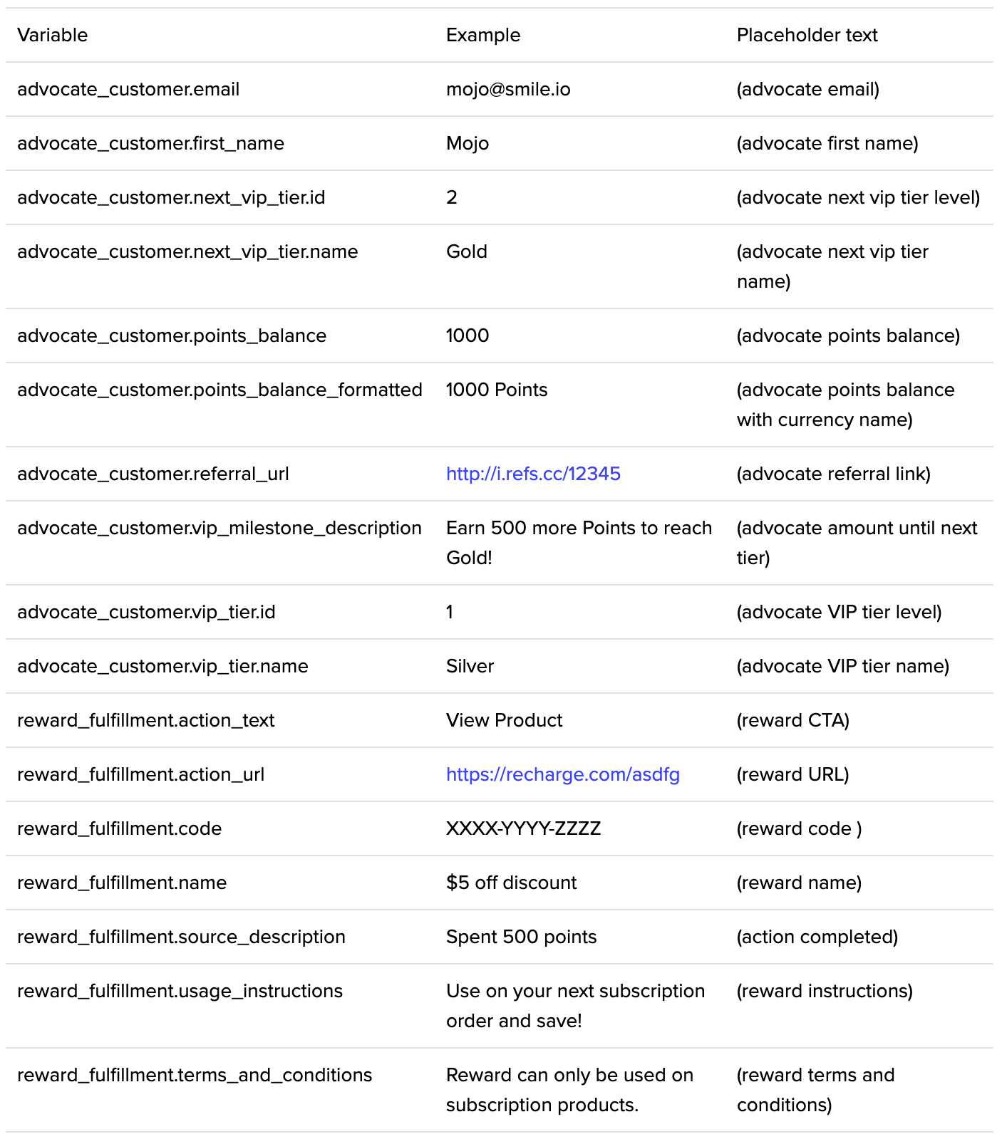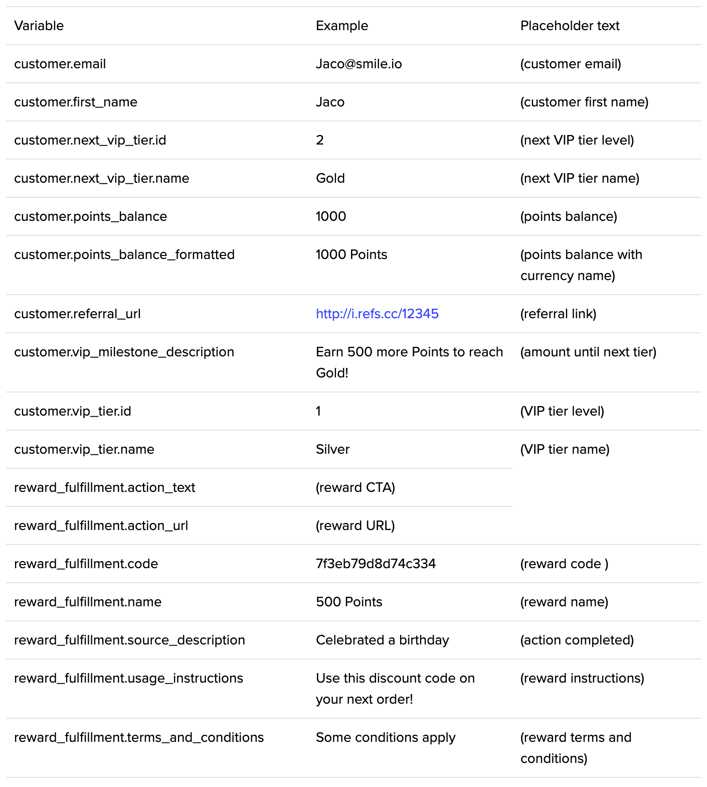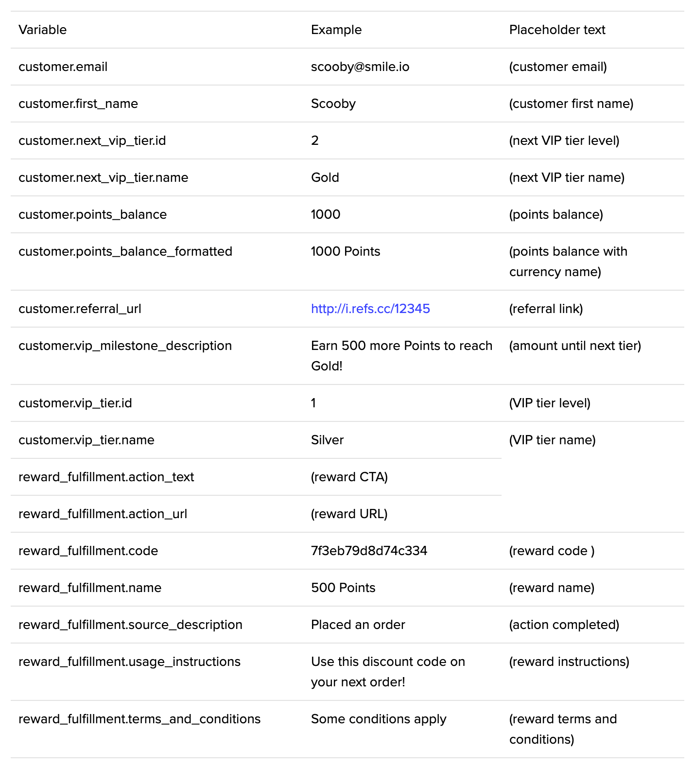 Customers who spend their points on a reward, whether a $ or % of coupon, free product, or any other reward you’ve configured will receive an email of this type. See an example here.| Variable | Example | Placeholder text |