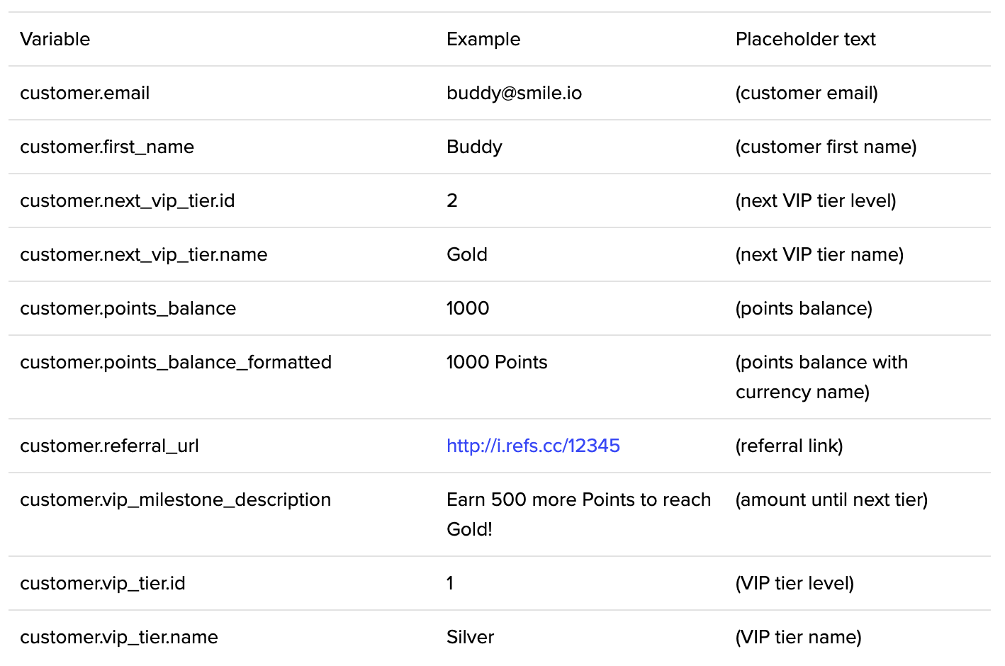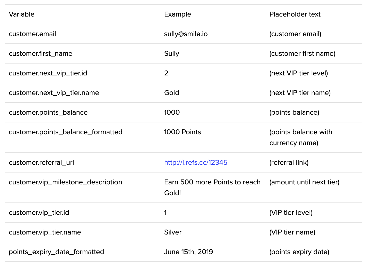 {{ }} around the variable for it to work correctly. If you see the placeholder text show up in the preview - you have added the variable correctly. For example - {{customer.email}}Points Earned