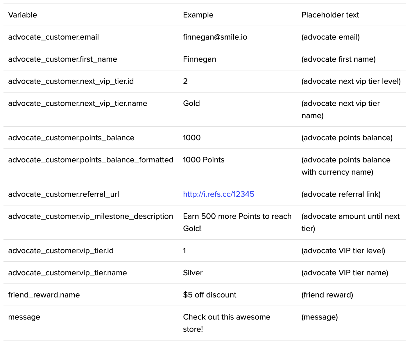 {{customer.referral_url}} | http://i.refs.cc/12345 | (referral link) |