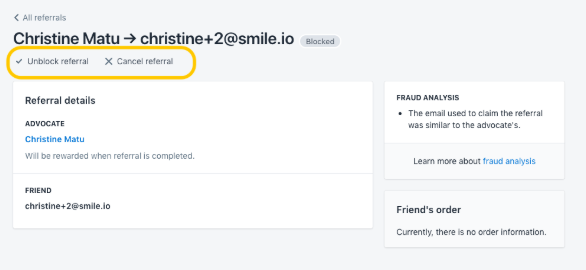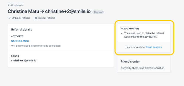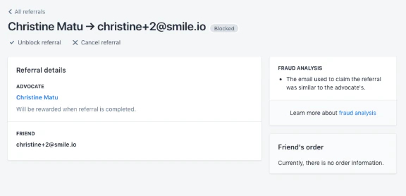 If we’ve flagged a referral as high risk of being fraudulent, you can view more details about it in your Smile Admin and decide to unblock or cancel the referral.Review the referral details