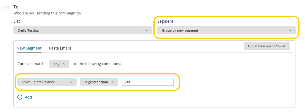 Smile ESPs make it easy for you to send customized messages to the different customer segments you’ve already set up with your email service provider. To do this, log into your ESP. Create a new email campaign and open up the To field.