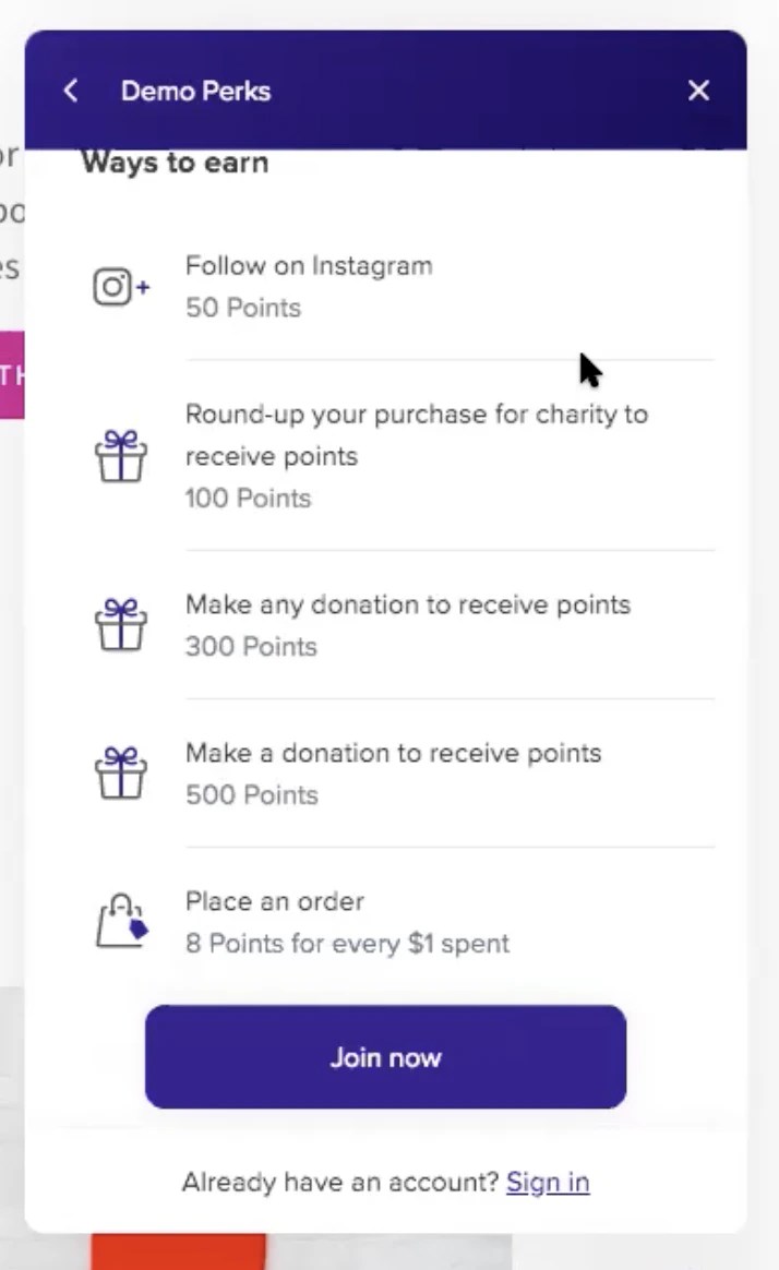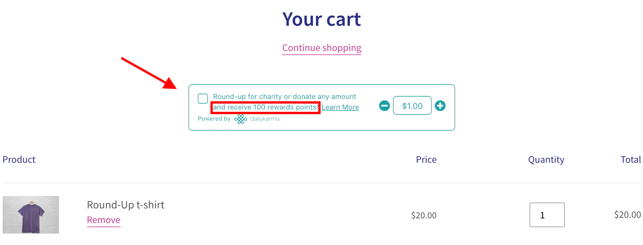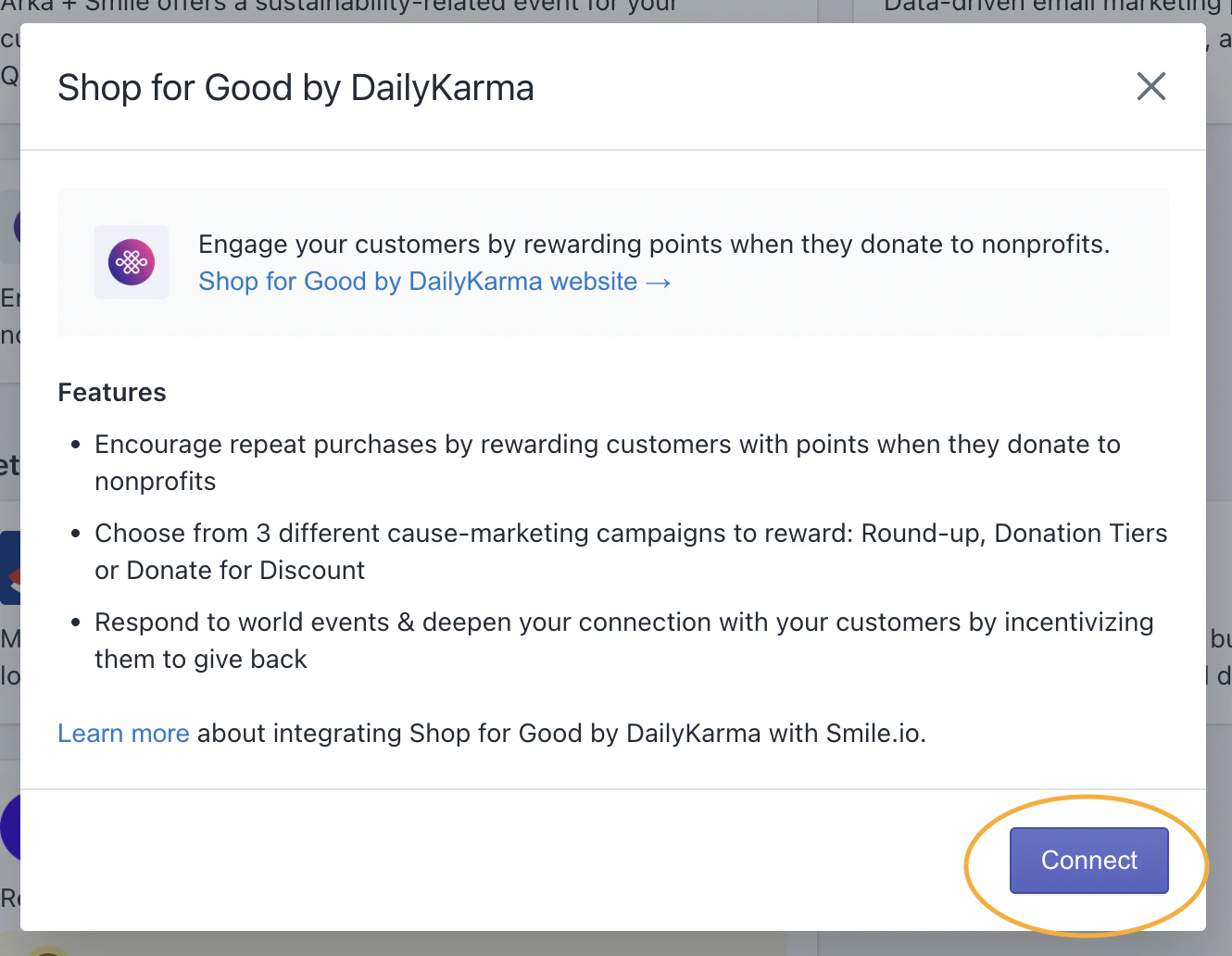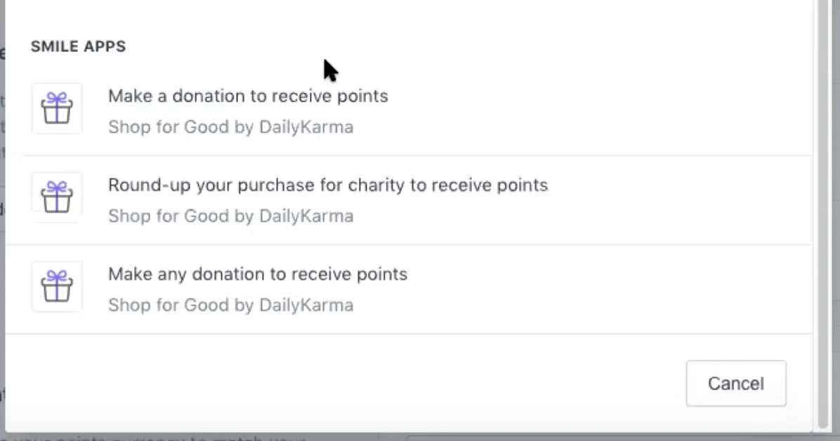 - This will prompt a pop-up displaying options for adding ways to earn. Scroll down to the Smile Apps section, and see the options for Shop for Good by DailyKarma. You can decide here whether you’d like your customers to earn points for making a donation, rounding up their purchase, or donation tiers.