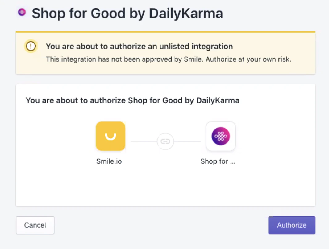 Shop for Good by DailyKarma allows you to align your give back initiatives with your marketing and sales goals and show your customers you support the causes they care about. This helps to support a good cause, build brand loyalty and increase sales at the same time.Smile apps/integrations are only available on a Smile paid plan, on the Shopify and BigCommerce platforms.