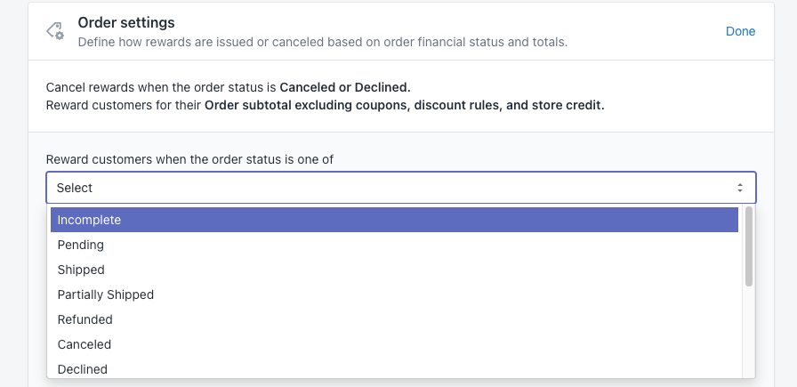 Once you’ve accessed your Order settings, you can choose which order statuses customers can earn points for. These statuses include:- Incomplete