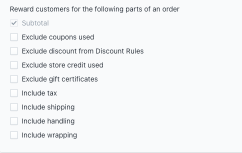 Your program’s order settings give you the option to reward customers for different parts of an order, including the subtotal, taxes, shipping, handling, wrapping. Simply check the box to include those as part of the rewardable total for the order.Excluding coupon discounts from earning points